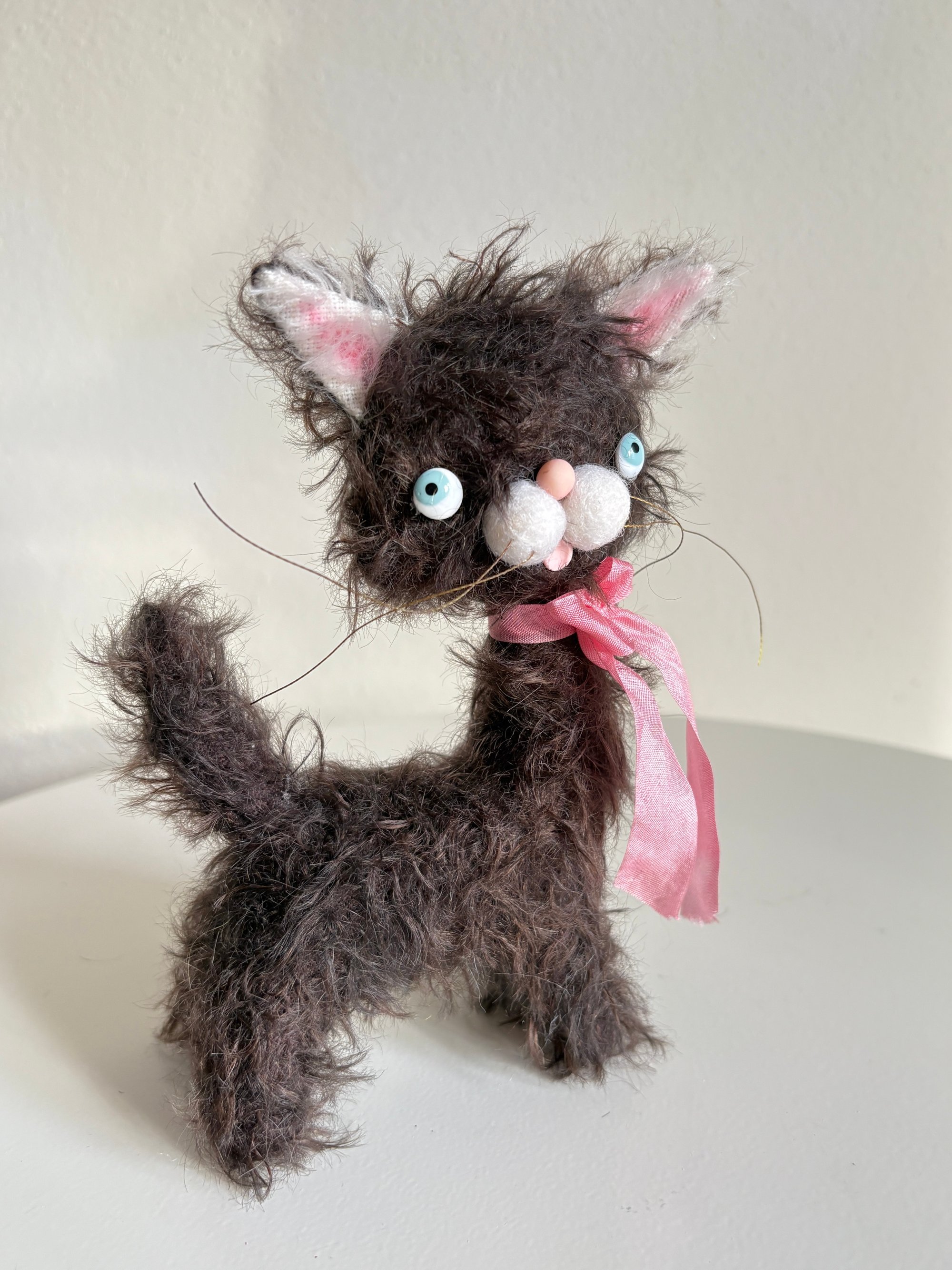 Hello Coco! Coco is a scruffy little alley cat, sewn in sparse deep brown mohair fabric.