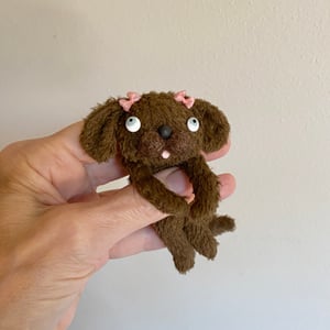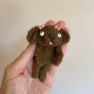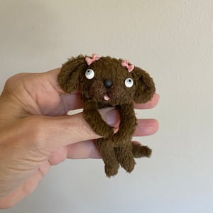 Coco is sewn in scruffy viscose fur and has big handmade eyes, needle felted snoot, and pure silk bows. She measures about 3.5 inches from head to tail.