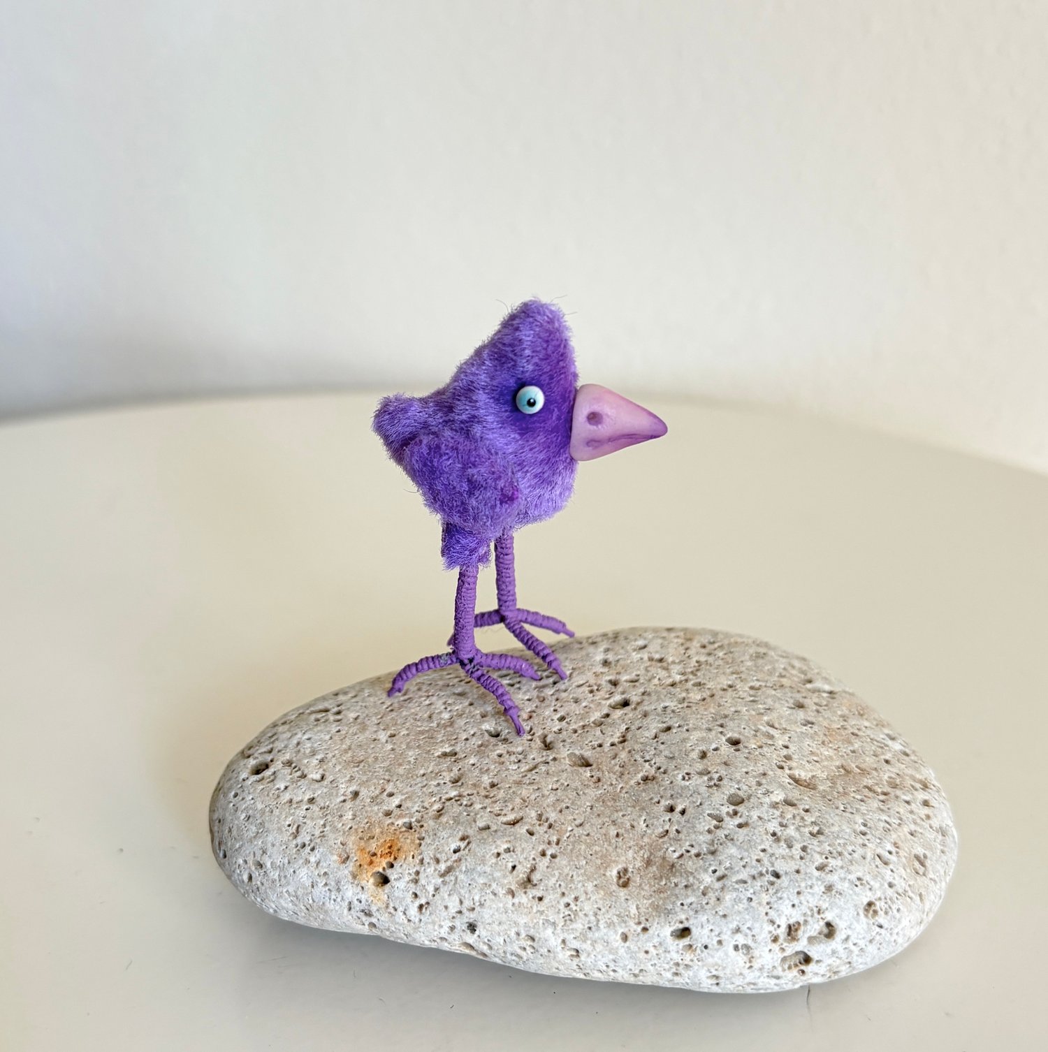 This teeny tiny tweeter stands on her own, at only about 1.5 inches tall. She is bitty sewn in vintage crushed velvet! Her legs are made of floral wire wrapped in floral wire. Her beak is sculpted in cold porcelain clay. Her eyes are also hand made by me.