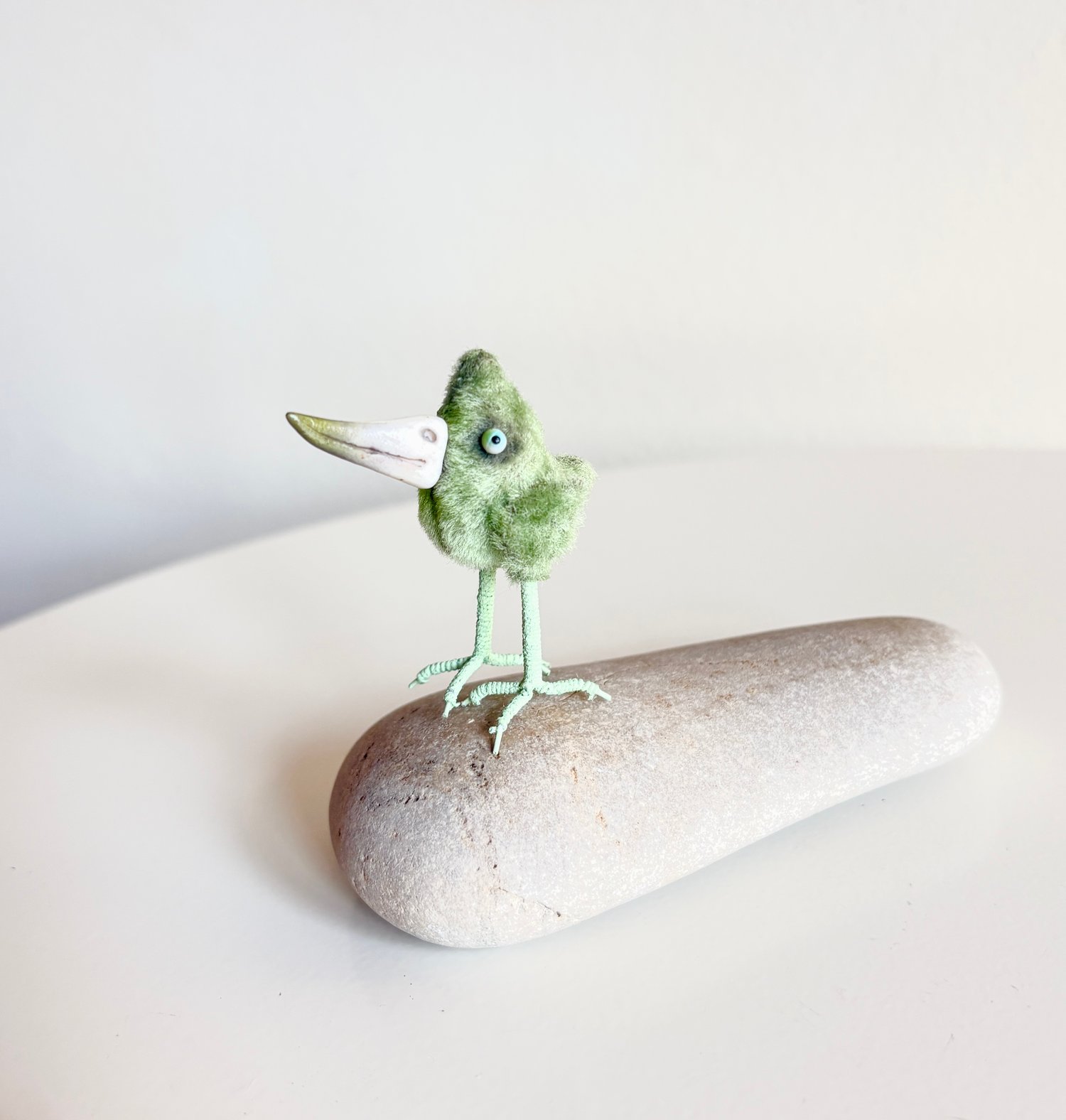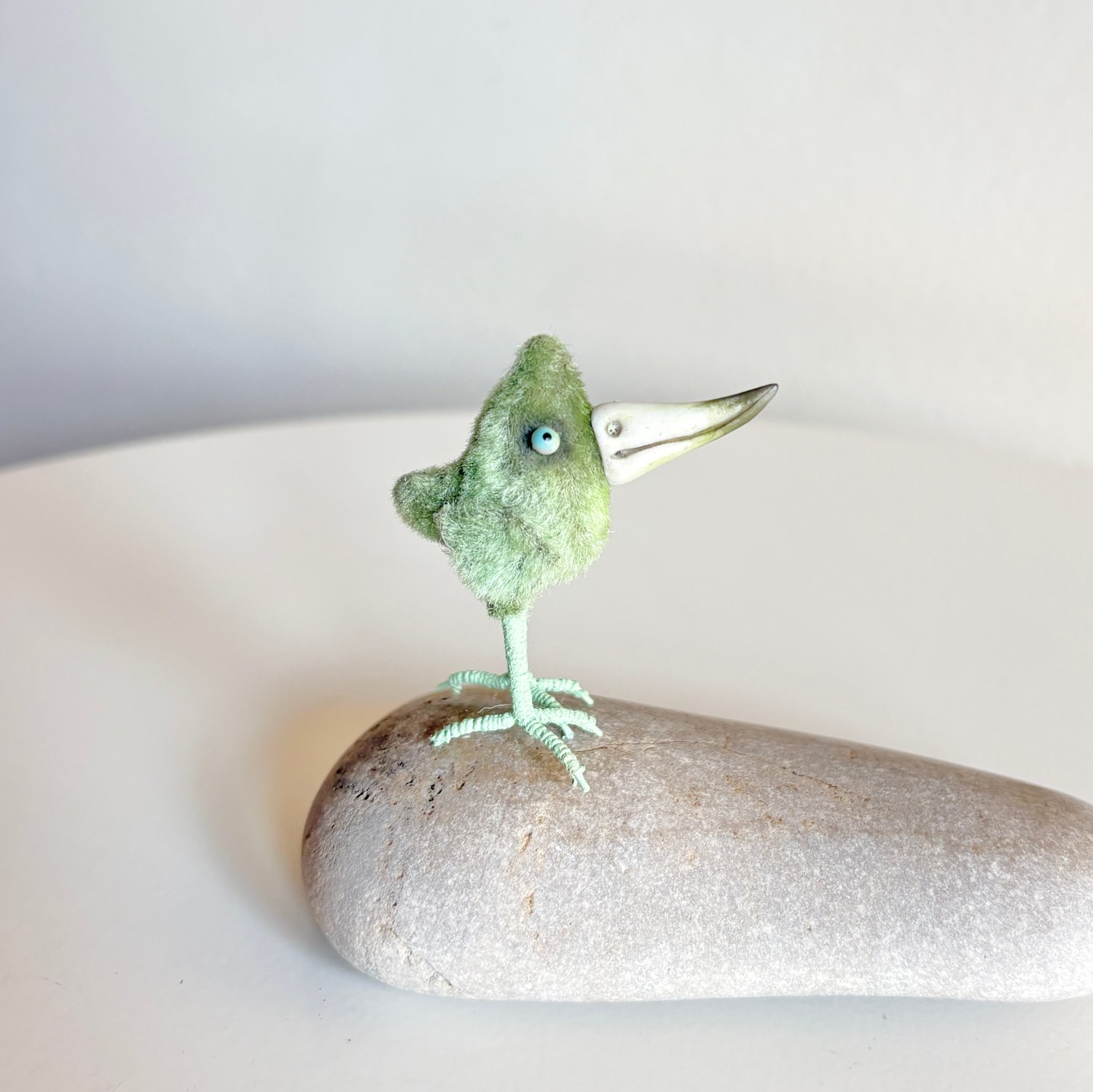 This teeny tiny tweeter stands on her own, at only about 1.5 inches tall. She is bitty sewn in vintage crushed velvet! Her legs are made of floral wire wrapped in floral wire. Her beak is sculpted in cold porcelain clay. Her eyes are also hand made by me.