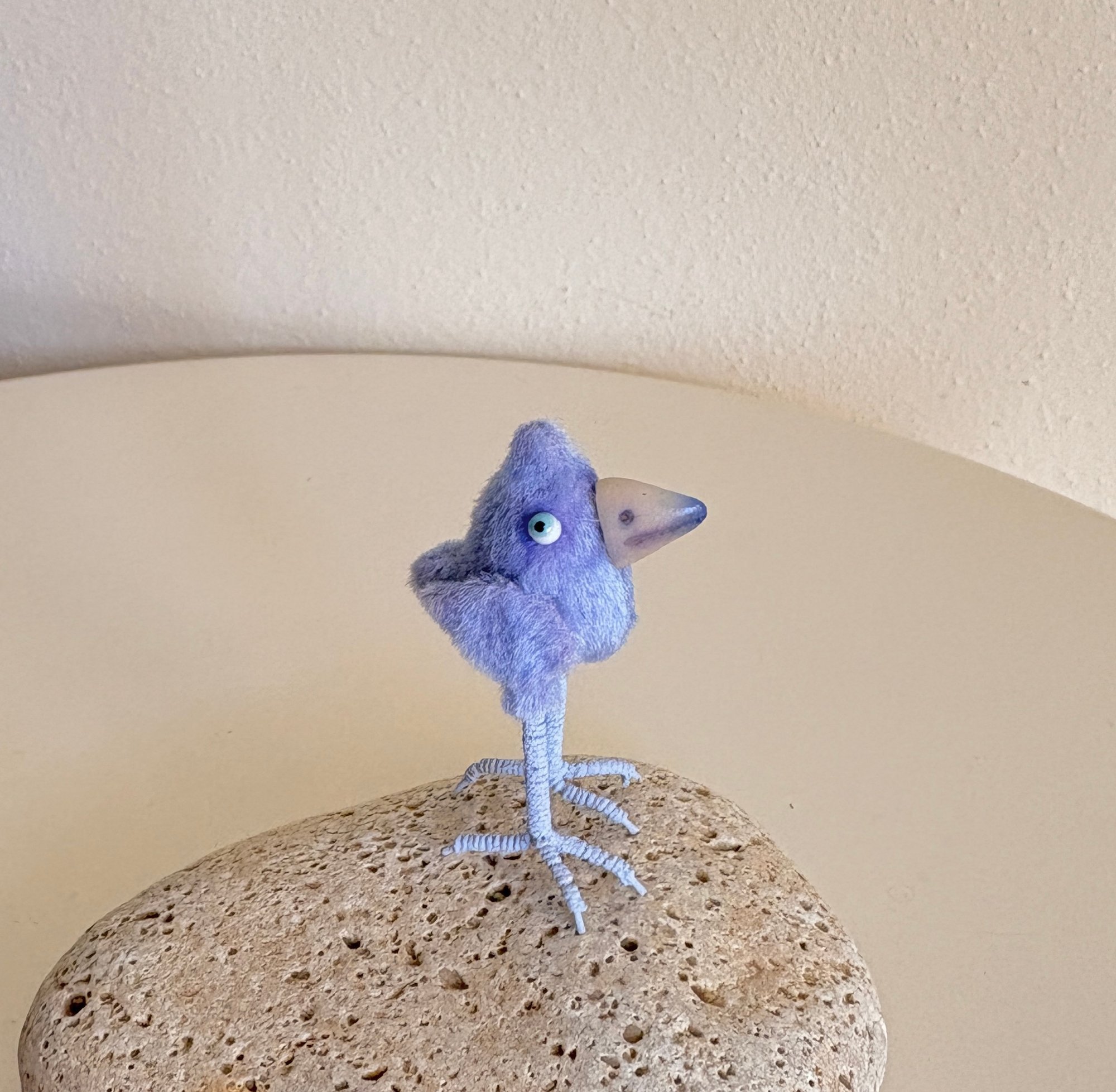 This teeny tiny tweeter stands on her own, at only about 1.5 inches tall. She is bitty sewn in vintage crushed velvet! Her legs are made of floral wire wrapped in floral wire. Her beak is sculpted in cold porcelain clay. Her eyes are also hand made by me.