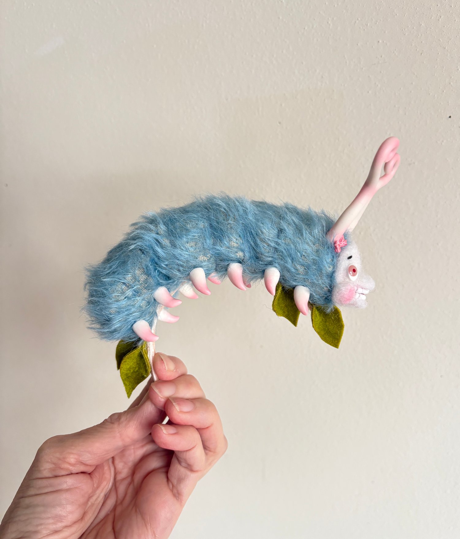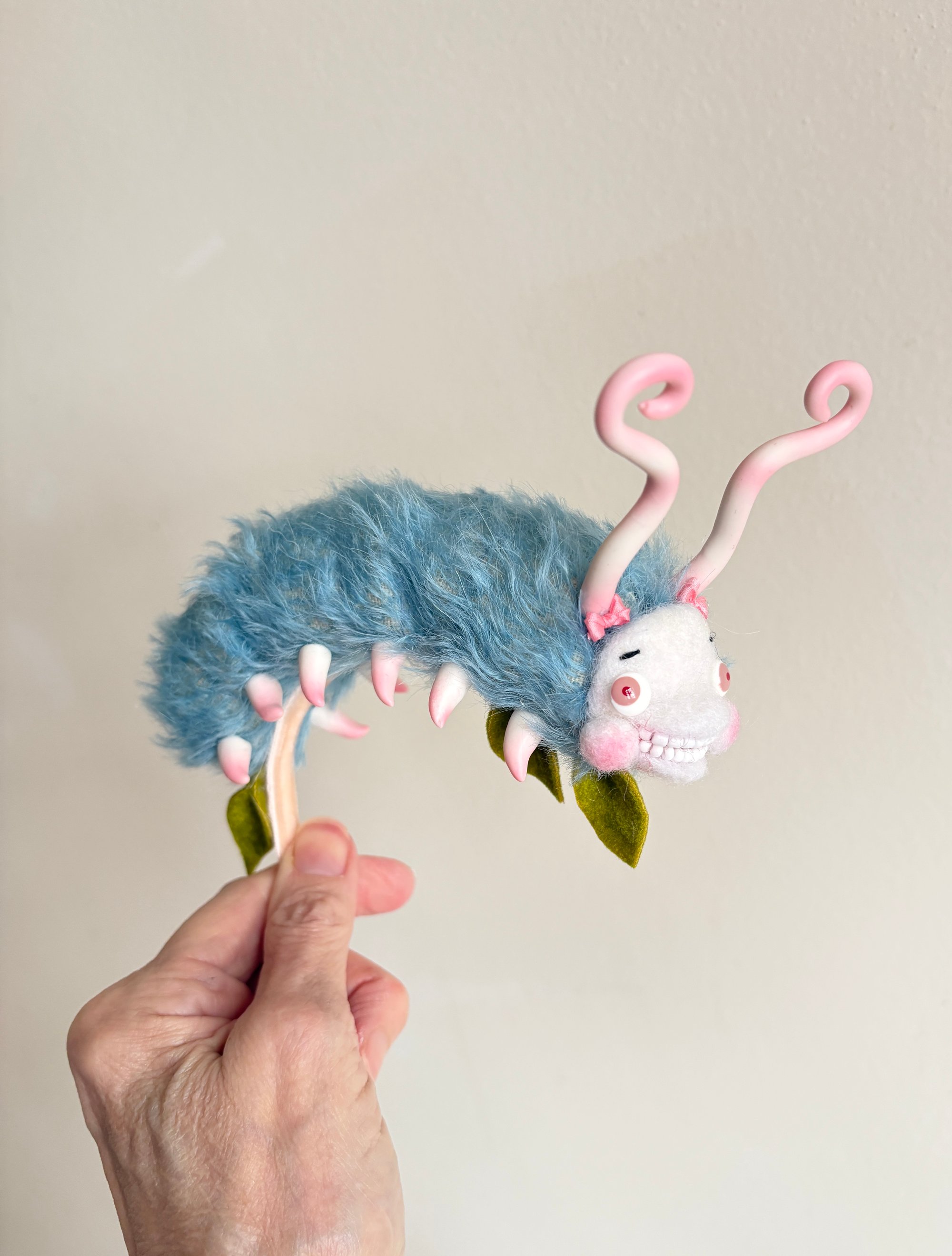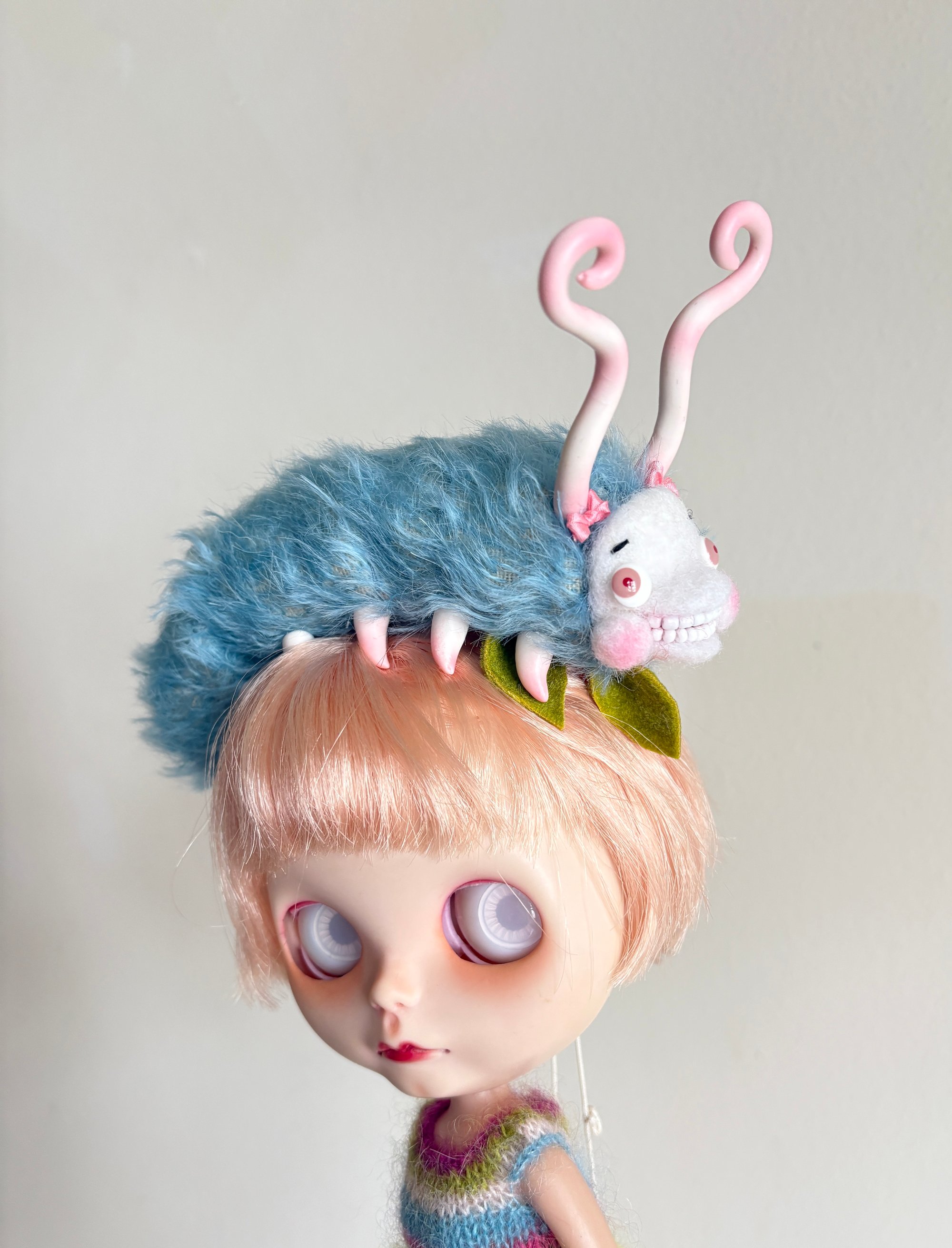 It's Caterpillar! On her head!! YES! A gorgeous little happy worm in mohair fur, with a needle felted face, handmade eyes, curly polymer clay antennae, AND the cutest little pointy feets!!!