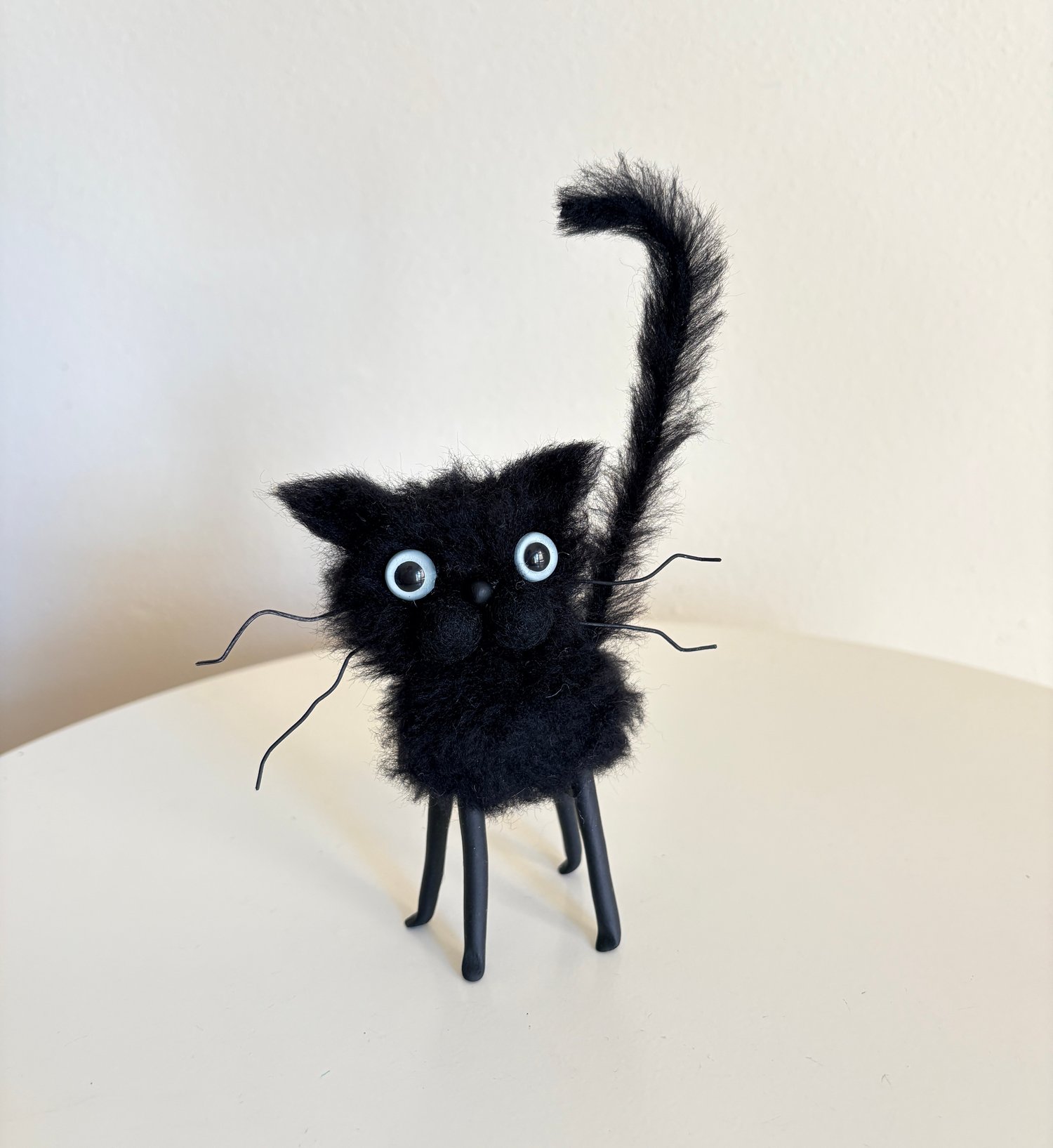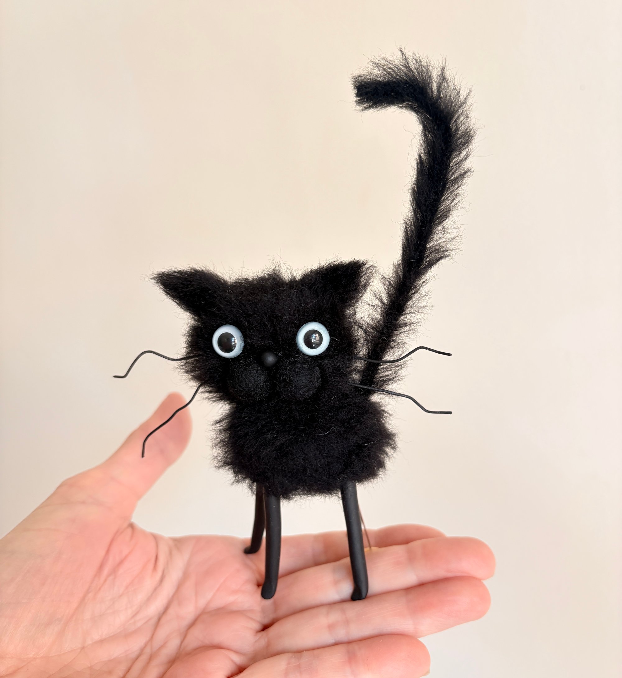Eddie stands about 4 inches tall. He is sewn in faux fur. His tail is wired and bendable. Eyes are hand painted. Legs are polymer clay. Watch out!!