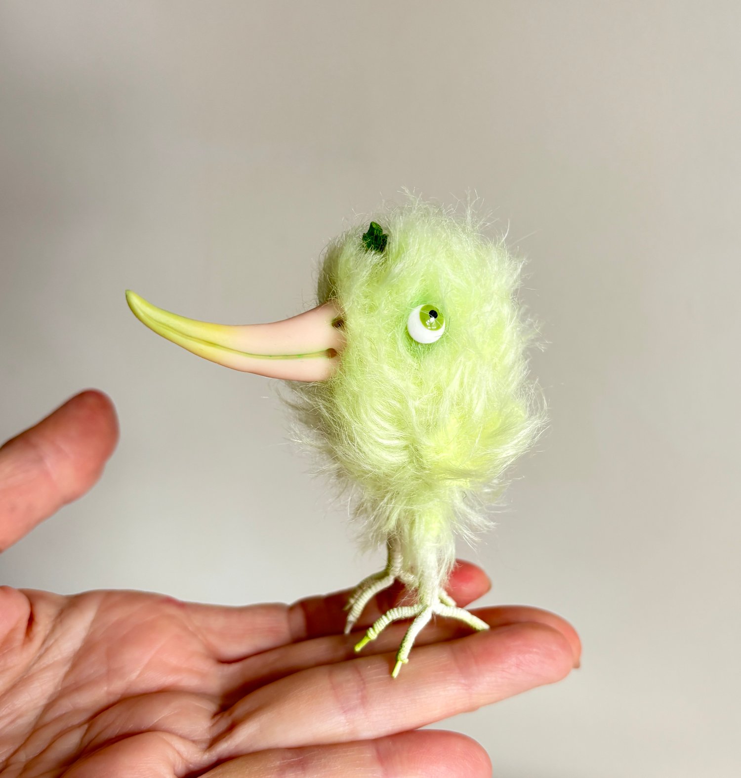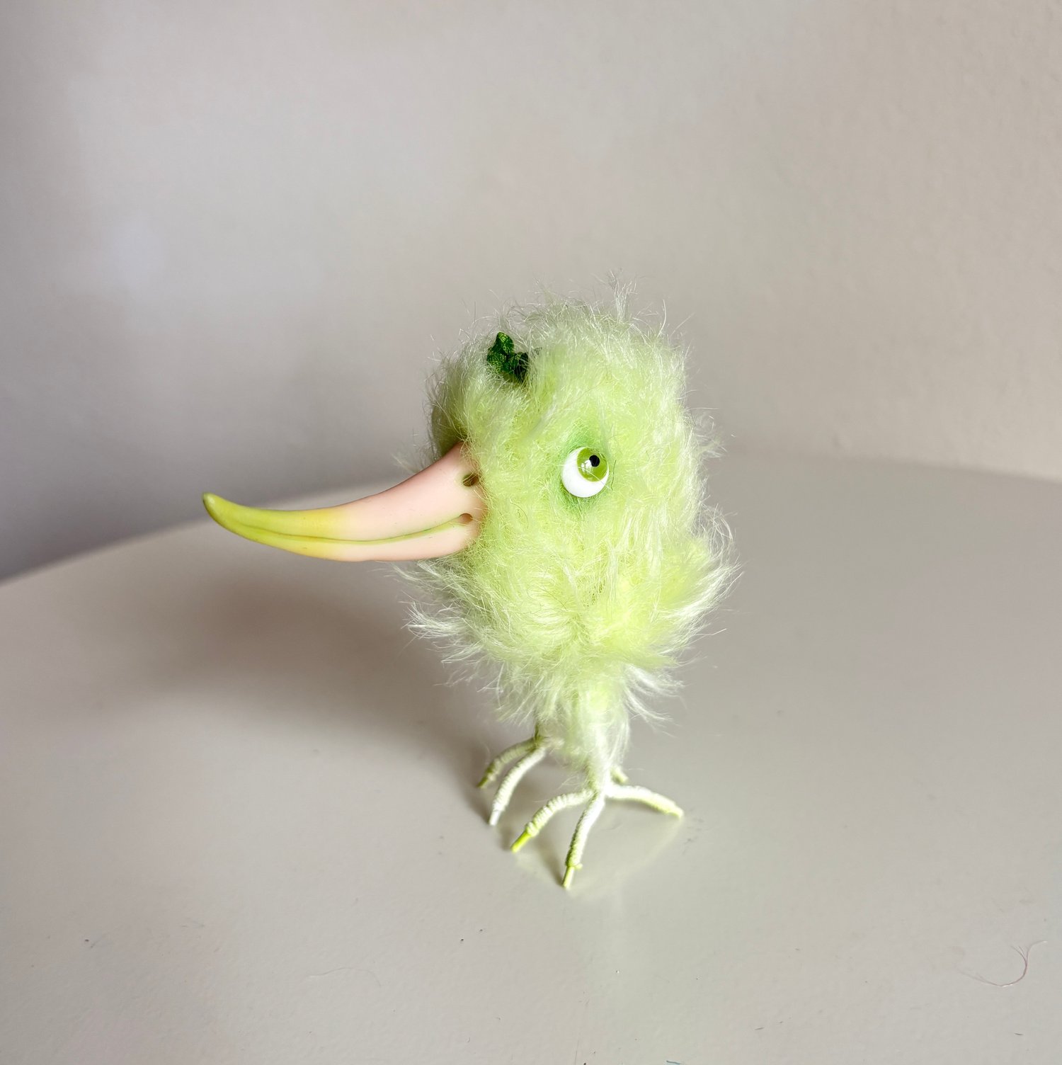 This adorable bird stands about 4 inches tall. She's sewn in scrap mohair fabric. Her legs are made from floral wire. Her eyes are handmade and painted by me. She wears a tiny pure silk bow on top of her head.