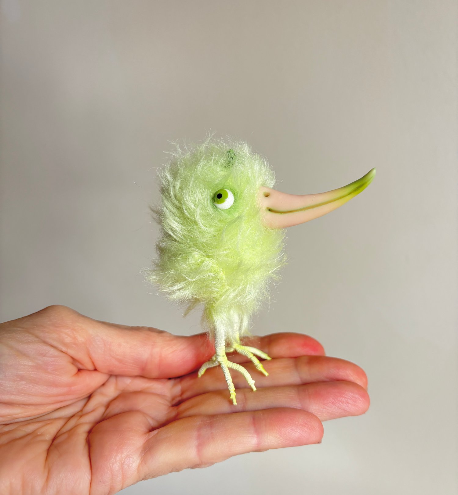 Look who just flew in! Esmeralda the scrappy bird...the first in my new series of birdies made from scrap mohair fabric..