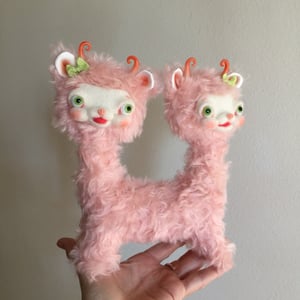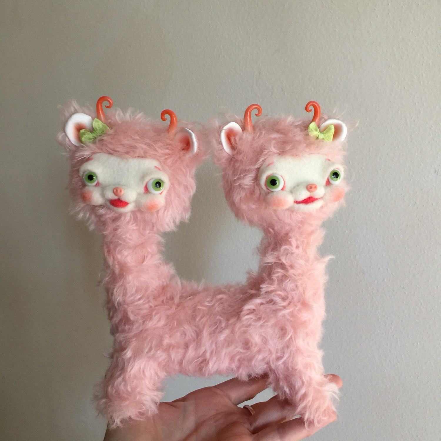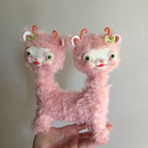 Fanny and Prudence are sewn from a dense and luscious curly pink mohair, and their expressive faces are needle felted in pure wool roving. They have big vintage German glass eyes, handmade tiny horns, and sweet little signature Violetpie bows!