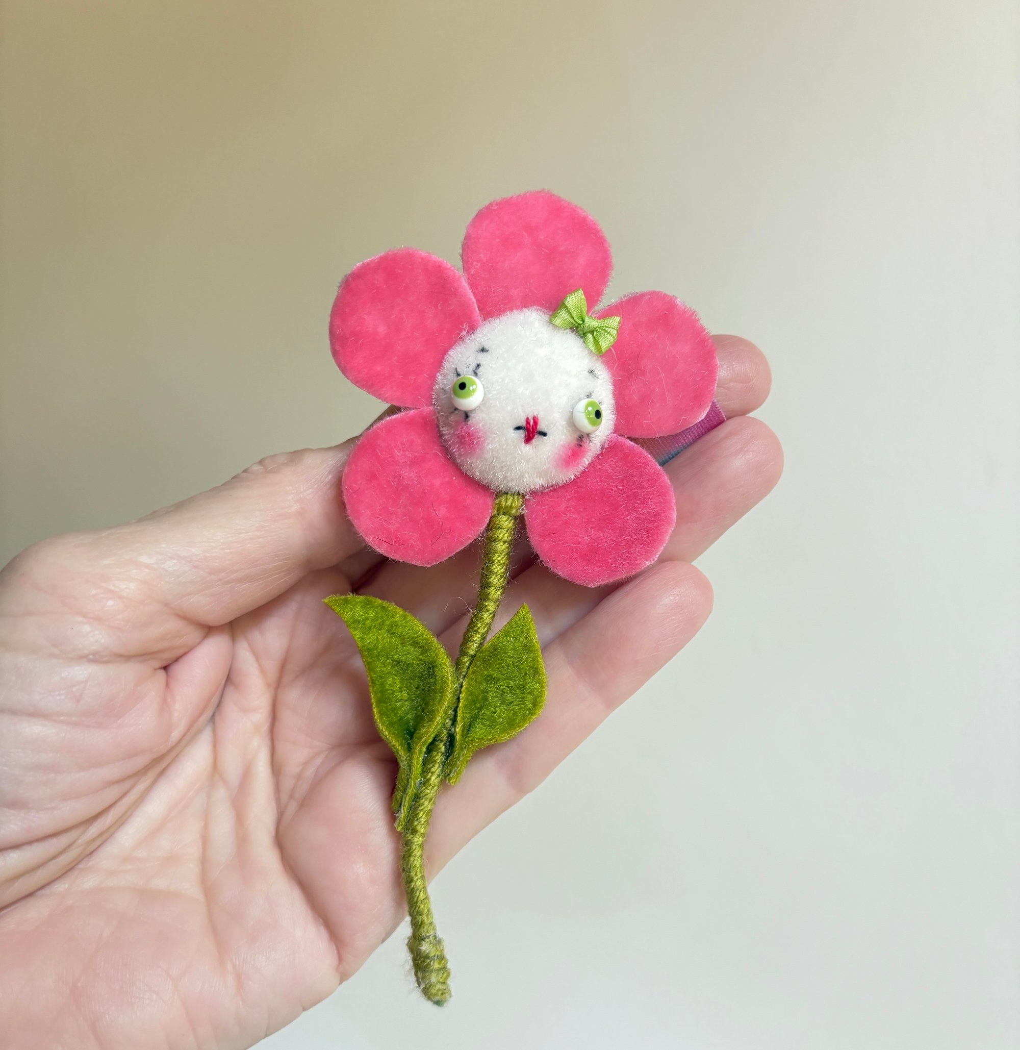 This little cutie has petals made from vintage crushed velvet, a yarn covered wire stem, and a velvet face, complete with a pure silk bow!