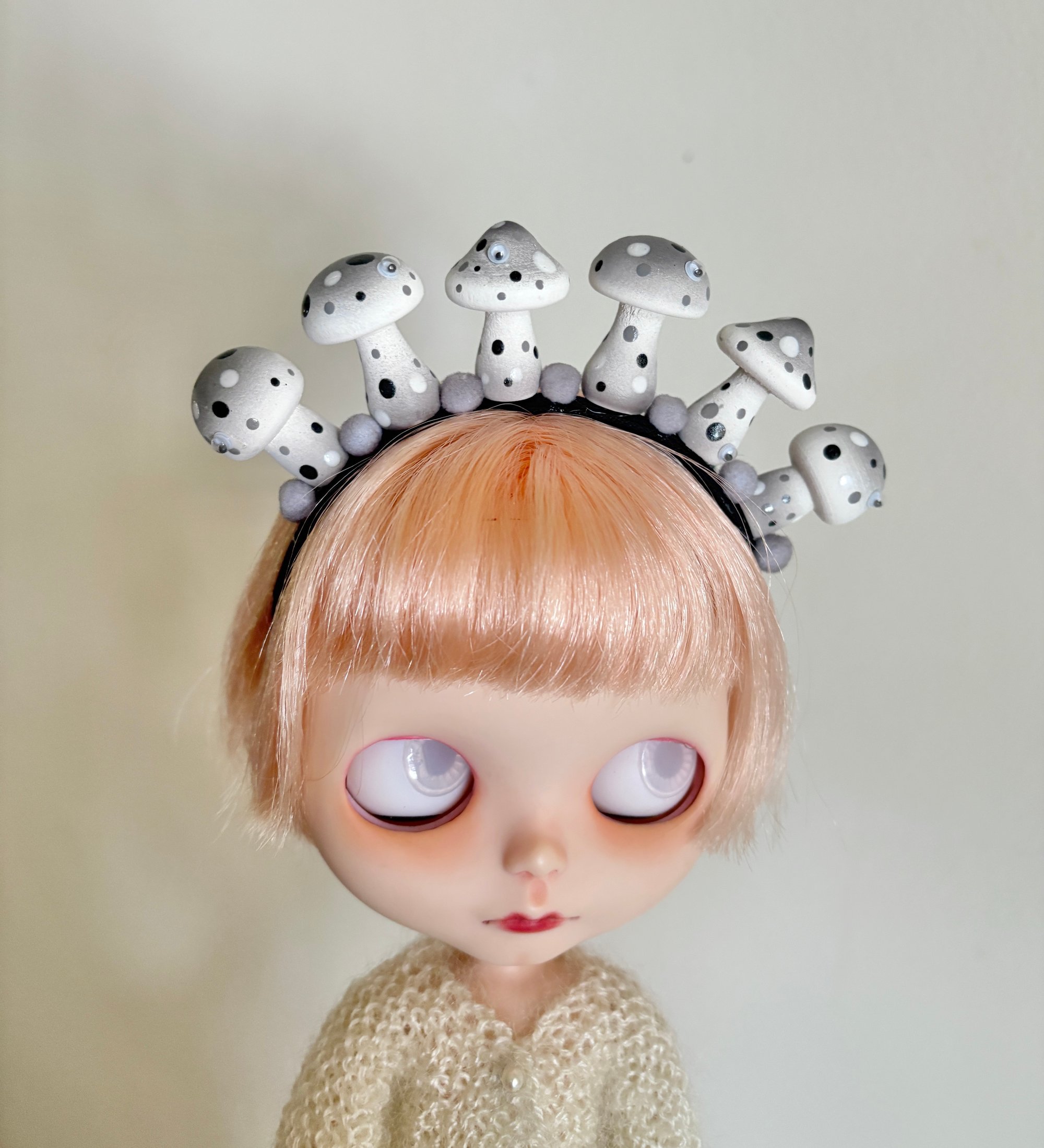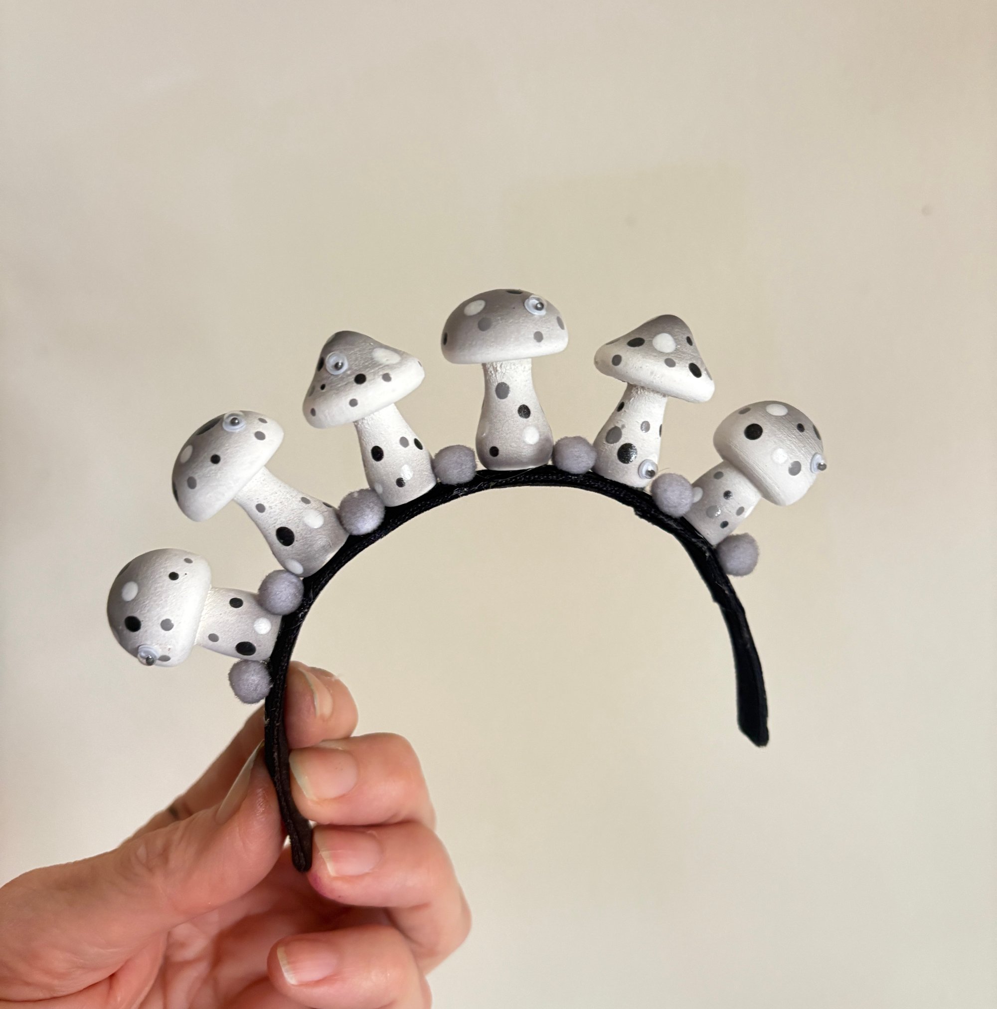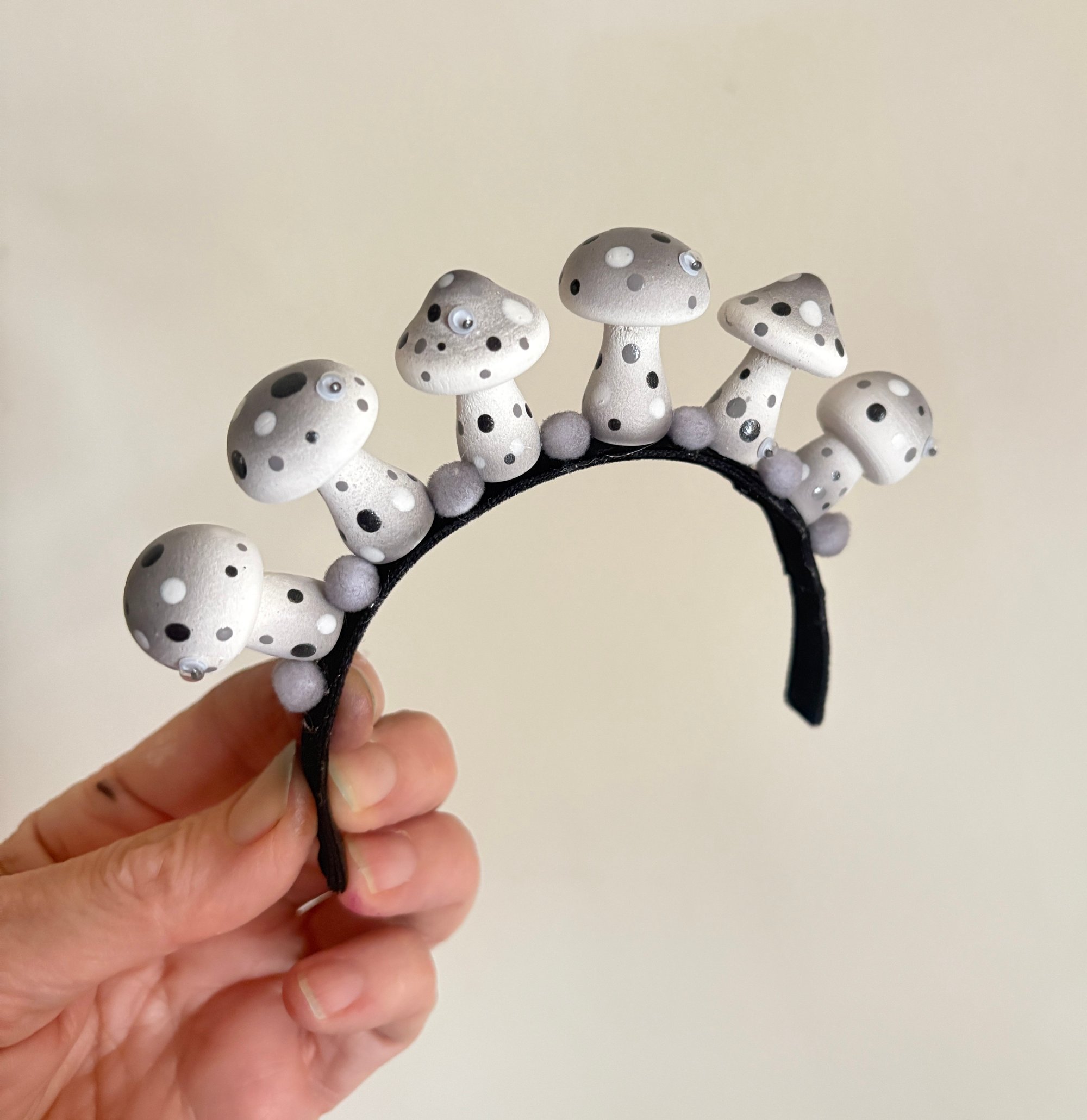 The mushrooms are made of wood, which I have hand painted. Each one has a google eye staring back at you. They are lined up on a beautiful velvet headband.