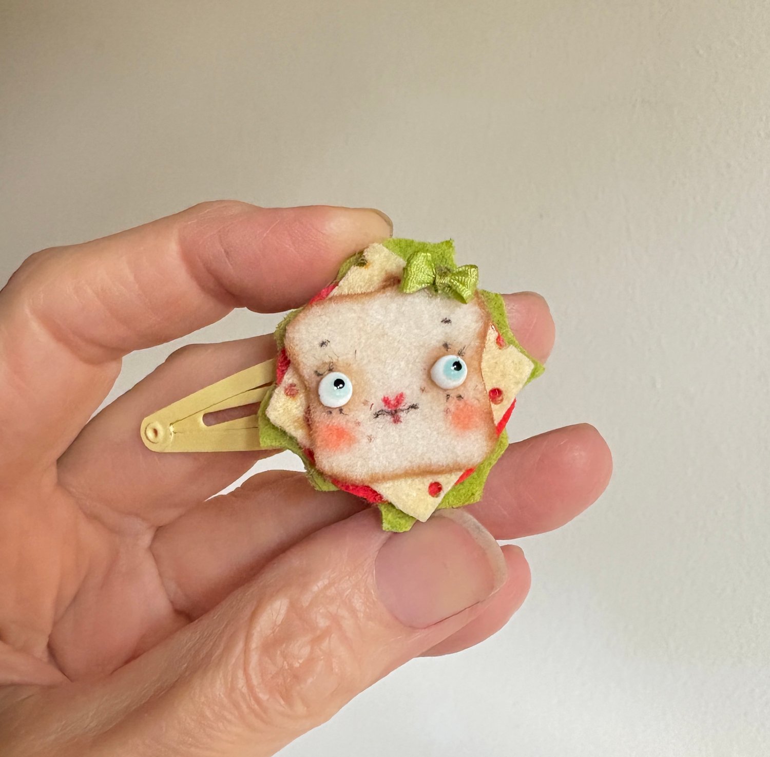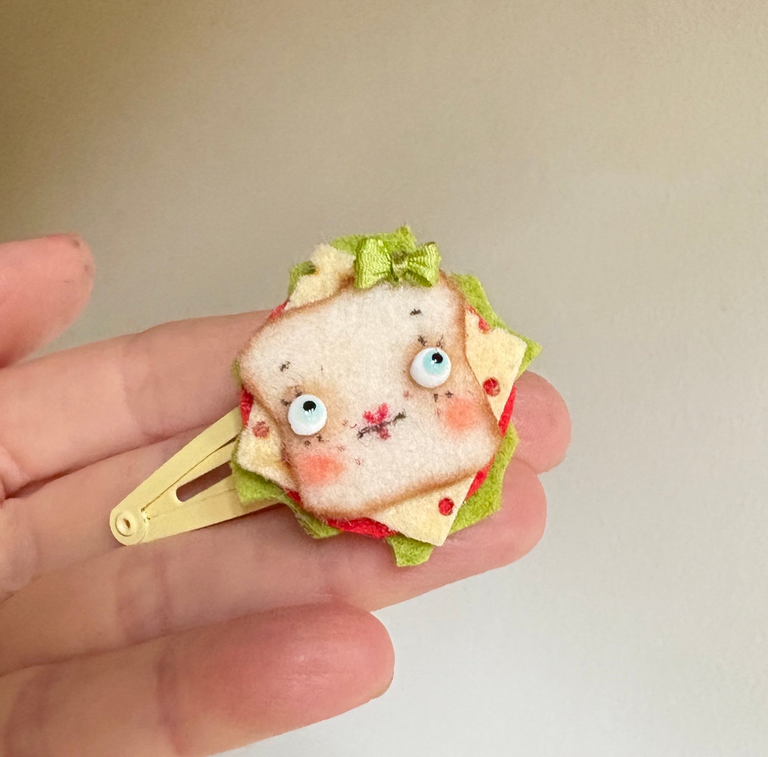 This little sammy measures about an inch across (not counting the hair clip). The sandwich itself is made of wool felt with handmade eyes and appear silk bow. It's mounted on a beautiful high-quality snap clip. Perfect for any doll that I headband would be too cumbersome on. Also the perfect size for a human!