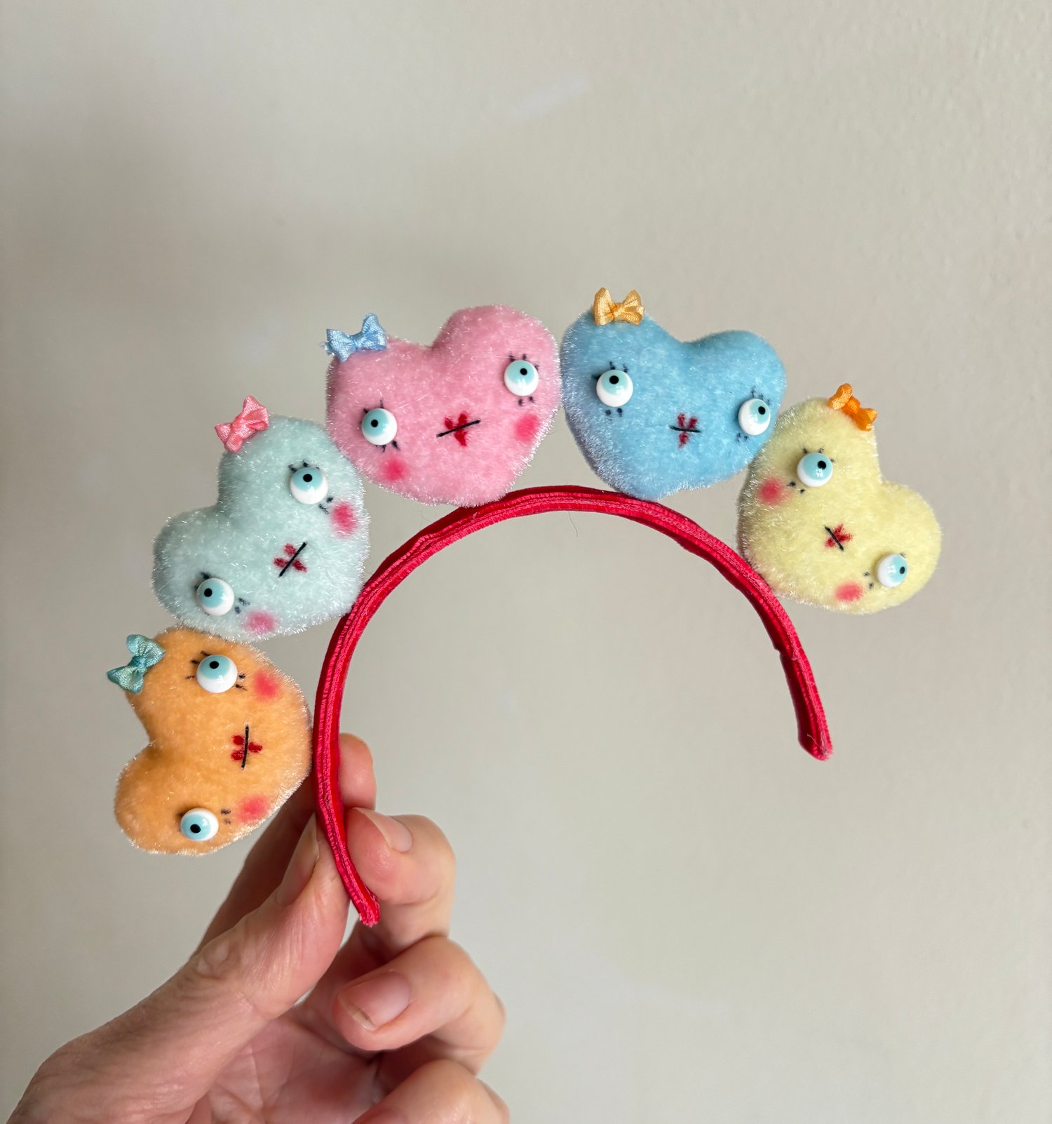 Just for Valentine's Day! A row of velvet "candy hearts" with smiling faces and silk bows! They're lined up on a beautiful red velvet headband.