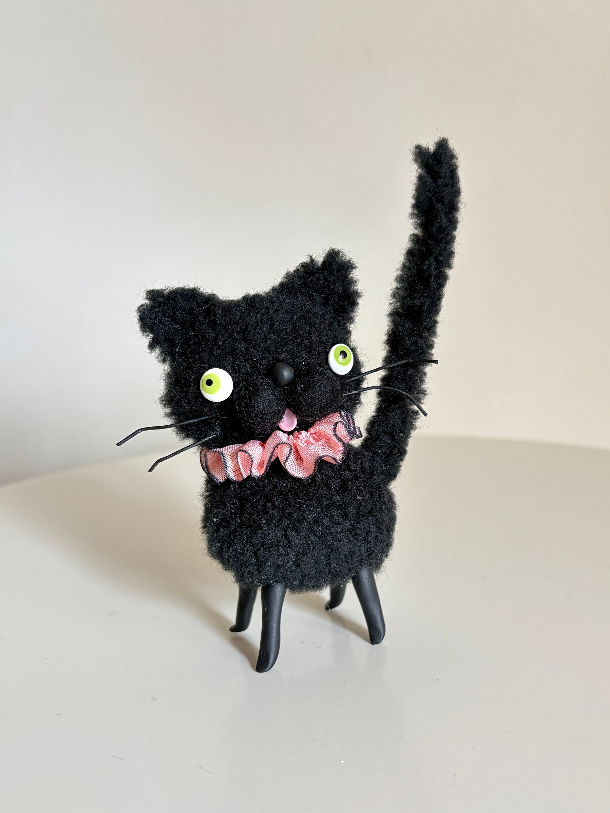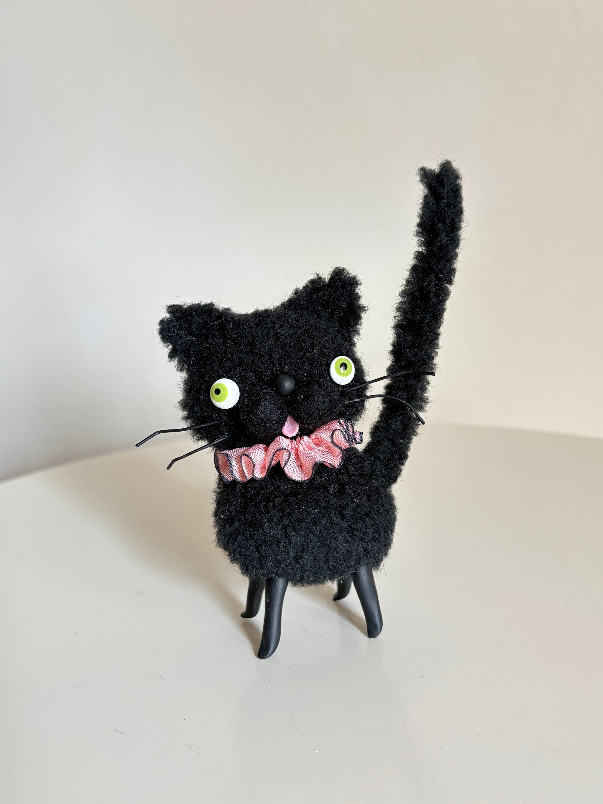 Welcome my Wooly Bully Cat, in curly Sherpa faux fur! She has stumpy legs and the cutest face ever! She's all dolled up with a pink ruffle!